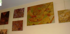 Wow.>>Got WOL (wow out loud) from me.>>Gorgeous, gorgeous stuff. I wish I could go to the gallery.>>But I want to touch them, so I’d probably get in trouble.>>I like the dark one on the left in the photo. I like ’em all, actually.>>Gawjus.>>I just posted some art on my blog, and now it seems dorky.>>You rock, Gay.
