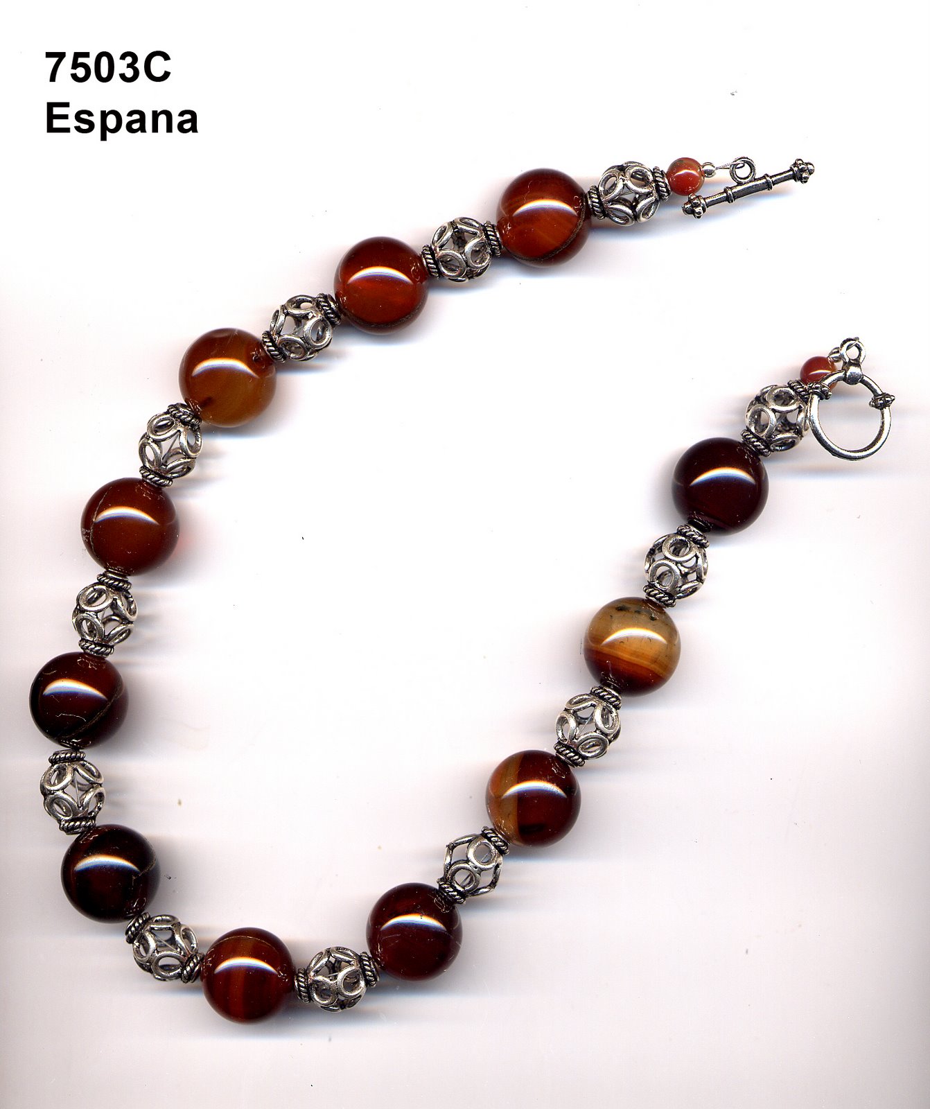 This is actually a necklace. The silver is sterling the large brown beads are carnelian. They’re 12 mm. so they are big. some one last night thought it was a bracelet.>>BTW, last night was a bust. Hopefully today will be better.